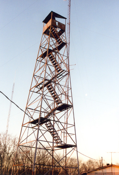 This is another drive-up with the summit benchmark located beneath a decomissioned lookout tower. I didn’t let that stop me, however, and climbed up a level or two to reach what was left of the staircase, climbing to the top at dawn and being higher than anyone in Kentucky for a spell! Paul Zumwalt in his book Fifty State Summits states he saw the tower was decommissioned during his visit in 1986.
