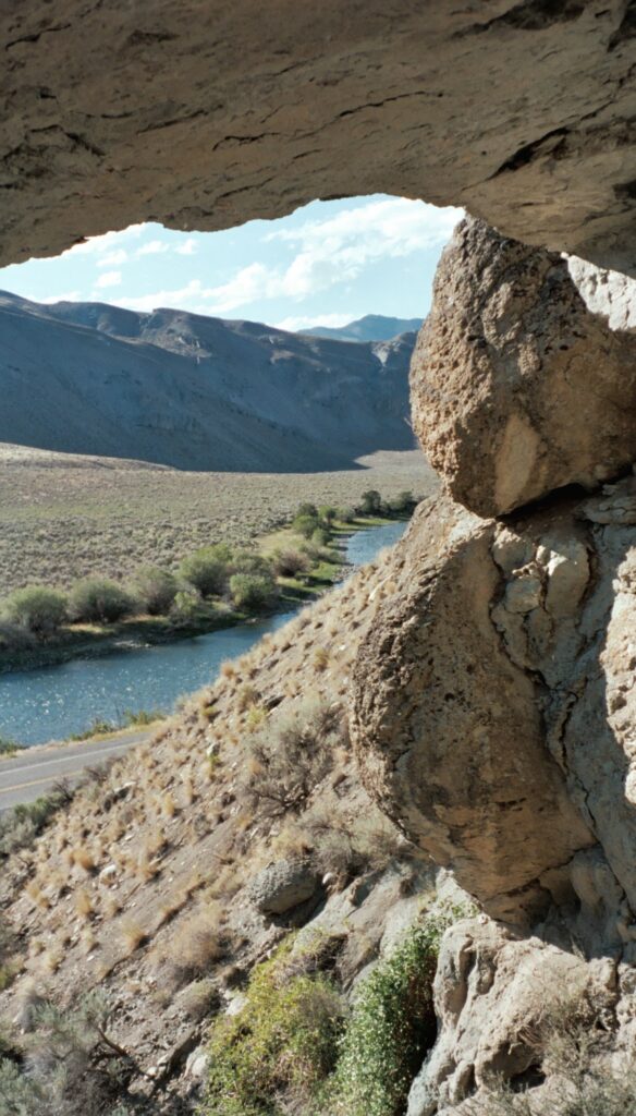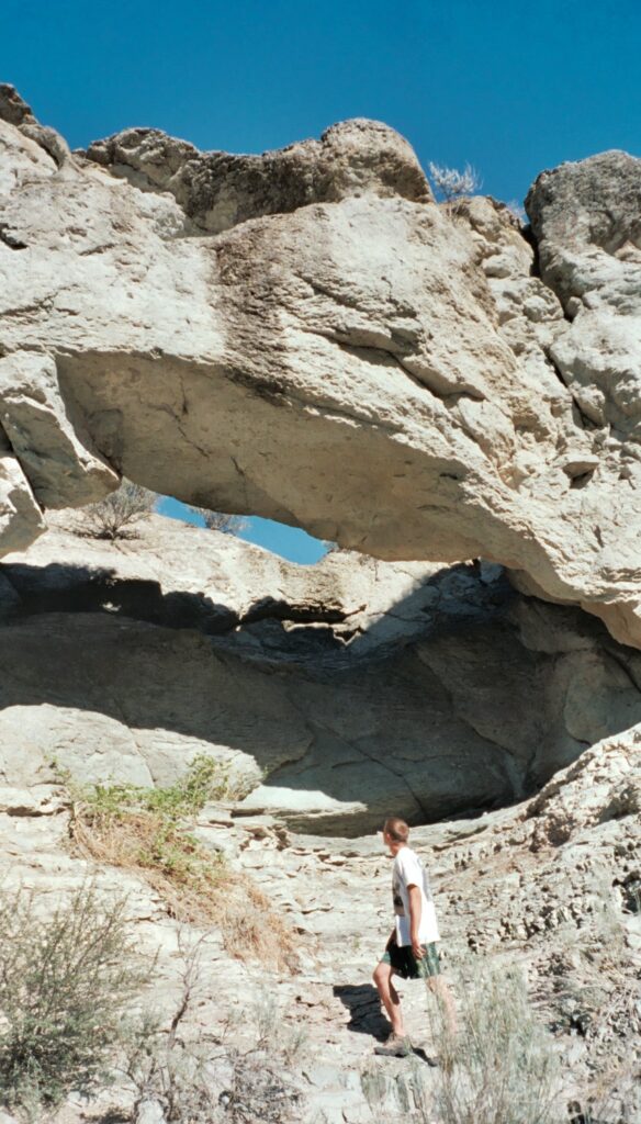 Borah as viewed from the valley. The fault trench visible in the foreground is the result of an earthquake in 1983 that caused the valley floor to drop three feet and the mountains to rise! So if you climbed it before that, the mountain is actually higher now!!Looking up at the start of COR, climbers are visible in red just below the high point.Once past the crux, the rest of the route traverses the ridge from the saddle to the summit and is easy Class 2, with a couple of Class 3 moves mixed in here and there. Me and Mikey on the summit of Borah Peak, 12,662. I love Mikey’s retro Anorak! Mikey grabs a lunch break out of the wind. The Lemhi range is siiiick with many other peaks over 11,000 feet. From the north ridge, the summit at center and the top of the classic NW couloir (snow climb) visible in the foreground. For many years that was a bucketlist item of mine… In this zoomed shot from the previous location, Teewinot stands guard and the top of Mikey’s head is just visible to the right of Tee. Mikey took an hour nap on the true summit!! Folks asked “how did you get your dog up here?” (referencing Chicken Out Ridge) and I said “he led the way!” Tee bone didn’t care about exposure! Looking east from the summitLooking west from the summit of Borah Peak. Looking north from the summit of Borah Peak. Looking south from the summit of Borah Peak. There’s some limestone down that way!! Brian and others have found some small karst features outside of Arco, Idaho. Packing up for the long descent. I love this photo of my brother! Mikey beneath this natural arch along Highway 93 south of Salmon, Idaho. Many years later Katt and I would revisit this spot. Classic Idaho scene!!