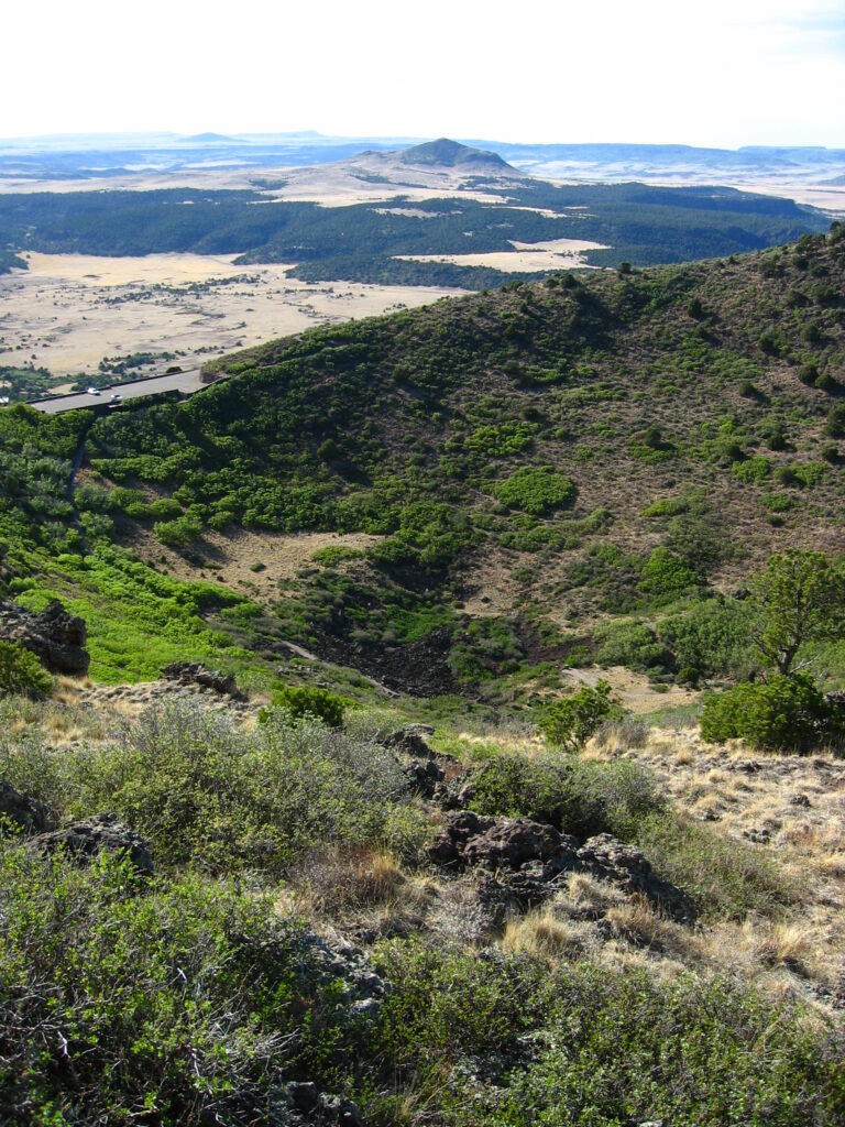 From the lofty summit looking down into the 400-foot deep crater. The parking lot at the edge is visible at left.