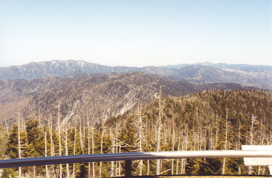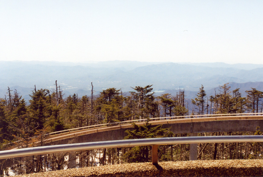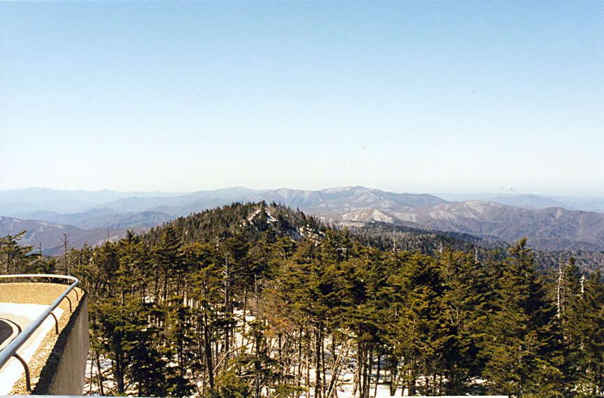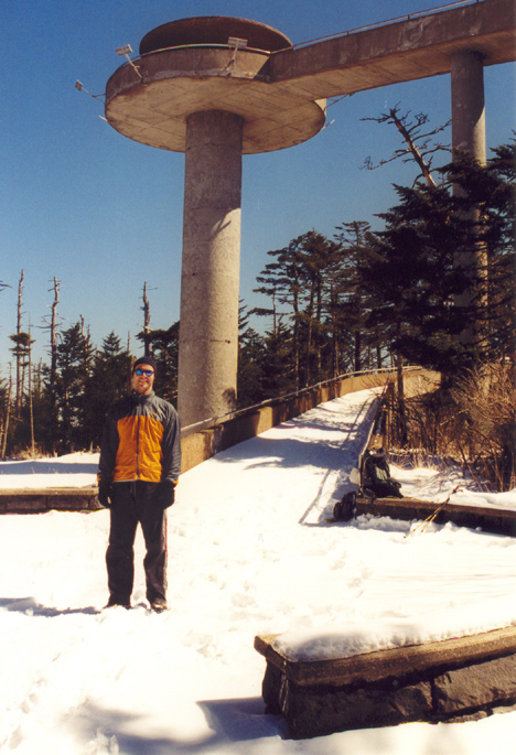 Kuwohi, previously named Clingman’s Dome, Tennessee lies at 6,643 feet MSL and is ranked #17 in elevation among US Highpoints. This would be my 18th highpoint of 2004. At the time of my visit, the road to the summit was closed at Newfound Gap in Great Smoky Mountains National Park, so I first decided to ski it, only to turn the first corner on the road to see a mile of bare pavement, so I quickly retreated and re-geared for hiking. I hiked the circuitous road on the way there, had the UFO to myself, and then hike the several miles back on the AT in the woods.