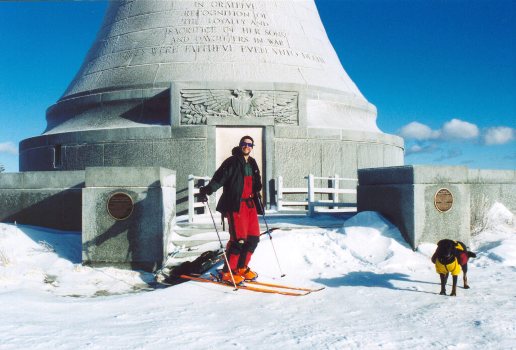 Mount Greylock, Massachusetts lies at 3,491 feet MSL and is ranked #31 in elevation among US Highpoints. This was my 5th US Highpoint of 2004 and my second highpoint that I skied after Wy’East. Although there was a closed auto road to the summit, we chose to skin up through the woods on a hiking trail, which was quite delightful and likely my first time skiing in a deciduous forest. Things took a turn on the summit however when the cold and wind conspired to force us to seek desperate measures – we were low on energy, needed food, but we couldn’t find anywhere to get out of the wind and were rightfully afraid that our hands would freeze.