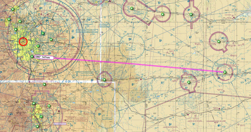 147 nautical miles from Denver to Goodland, Kansas, about a 90-minute flight in the Cessna.