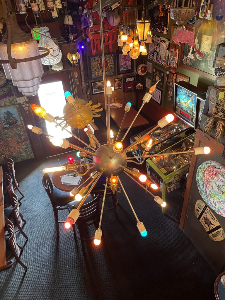 Barley Mill Pub contains an eclectic collection of chandeliers and other art. Tons to look at here!