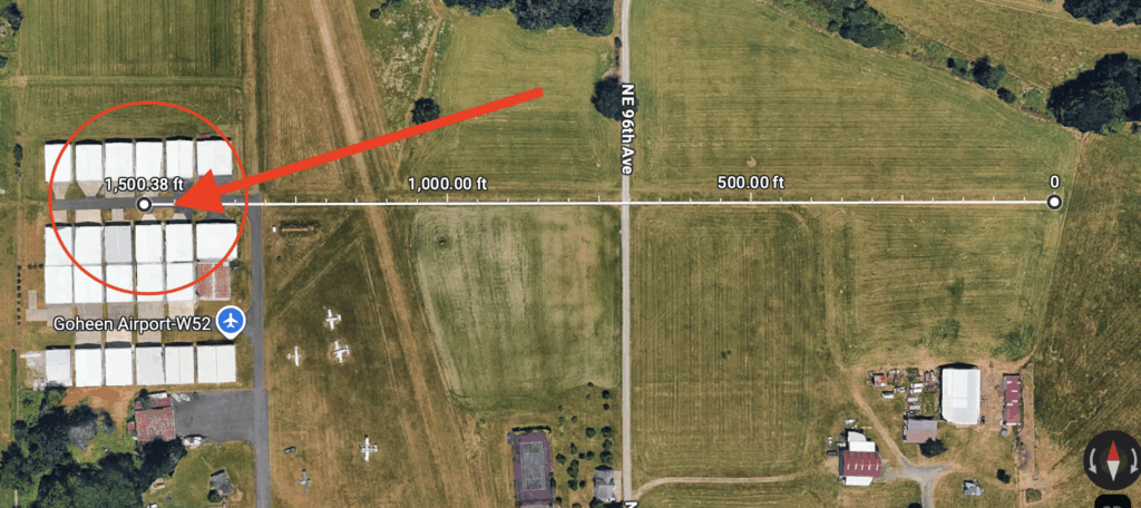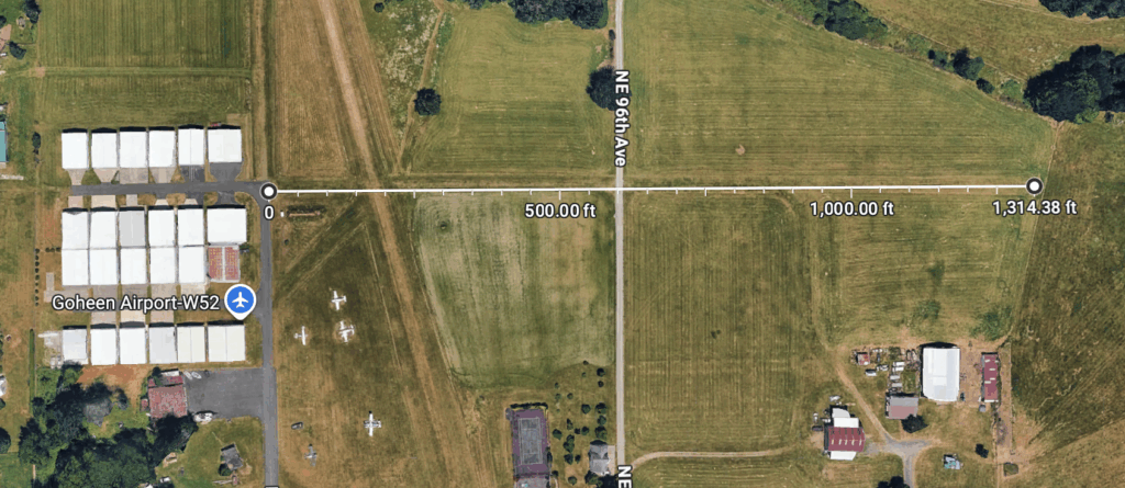 91500 published is disputed by the author: Utilizing runway 7-25 includes crossing a public road (NE 96th Ave) and from starting directly at the hangars, Google Maps measures only 1314 feet as in the graphic below: