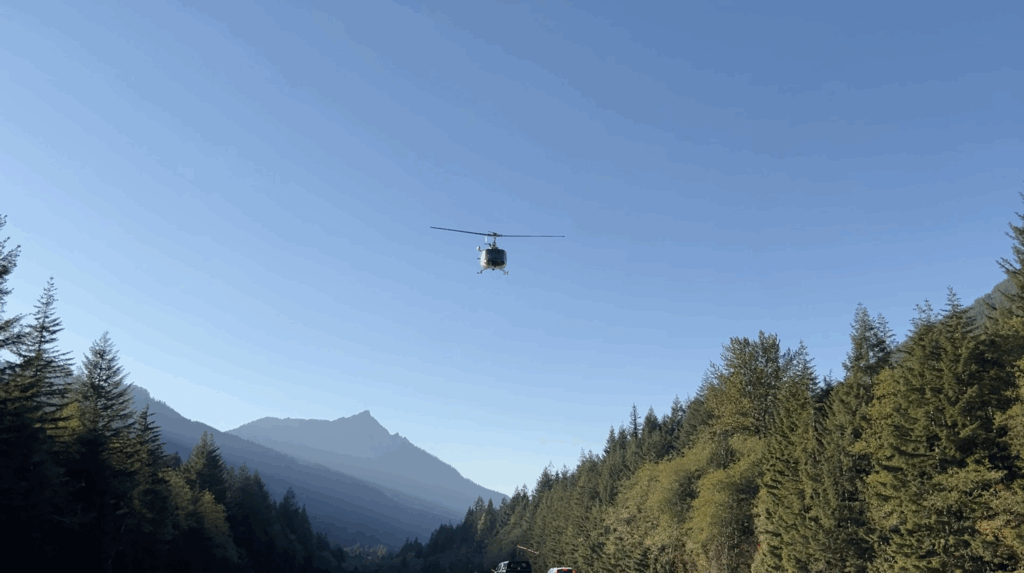 The King County Sheriff’s Bell UH-x1? “Huey” departs 4W0, Bandera State Airport during a mountain rescue operation. Here we drove in as it is right next to I-5 in order to inspect it for a later visit.