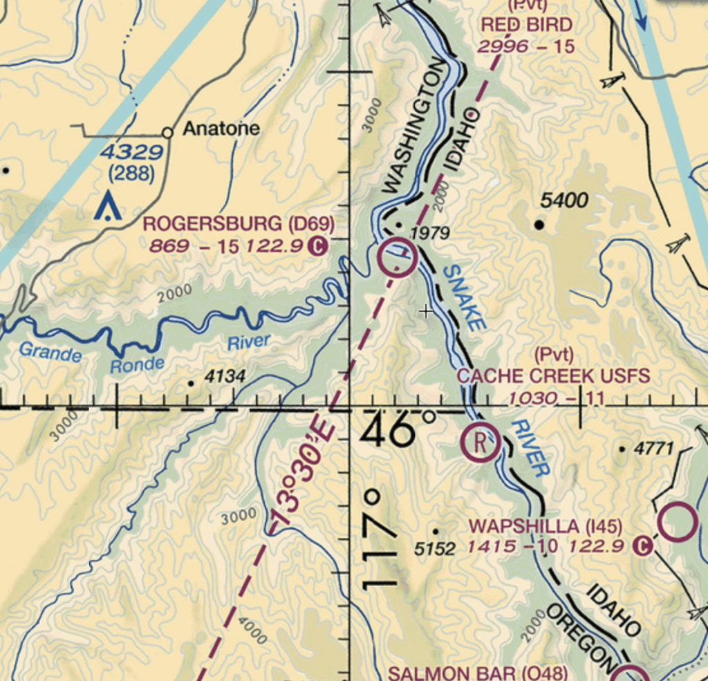 Rogersburg (D69) near the tri-state corner of Washington, Idaho, and Oregon on the Snake River. Screenshot skyvector.com retrieved 17 Aug 2025.