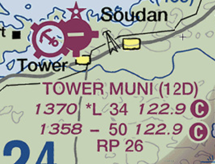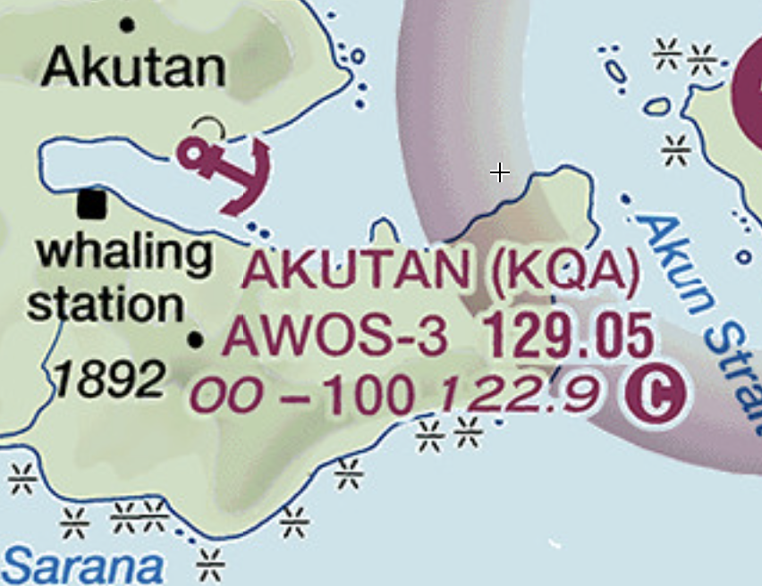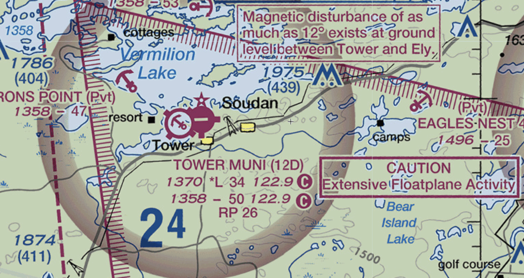 Lake Louise’s airbases are not co-located and have different airport IDs. Note the dash between the airport elevation and the longest runway length. Per the Aeronautical Chart User’s Guide, “When information is lacking. the respective character is replaced by a dash.” In this case, the availability of runway lighting “L” or “*L” is missing. Interestingly it applies to the seaplane base, which doesn’t make sense and I should consider opening an aeronautical inquiry to fix it. Tower Muni near the Boundary Waters Canoe Wilderness of northern Minnesota is a co-located Class E airport.Lucky Landing Marina SPB (06B), Bangor, MaineLong Lake SPB (9SB), Sinclair, MaineCordova Muni (CKU) co-located SPB. Note lack of services (tick marks) or beacon (star). Akutan (KQA) seaplane base near a whaling station in the Aleutians. The USFS base in Ely, Minnesota. Holy crap does that place have a history! There’s “a book or two” about the Boundary Waters Canoe Wilderness of northern MinnesotaTuntutuliak (A61) is a co-located airport with separate airport IDs. Satellite image suggests the SPB is the dock at the end of the runway, and is supported by the symbology above. CAUTION Extensive Floatplane Activity – northern Minnesota is a great place for seaplanes!