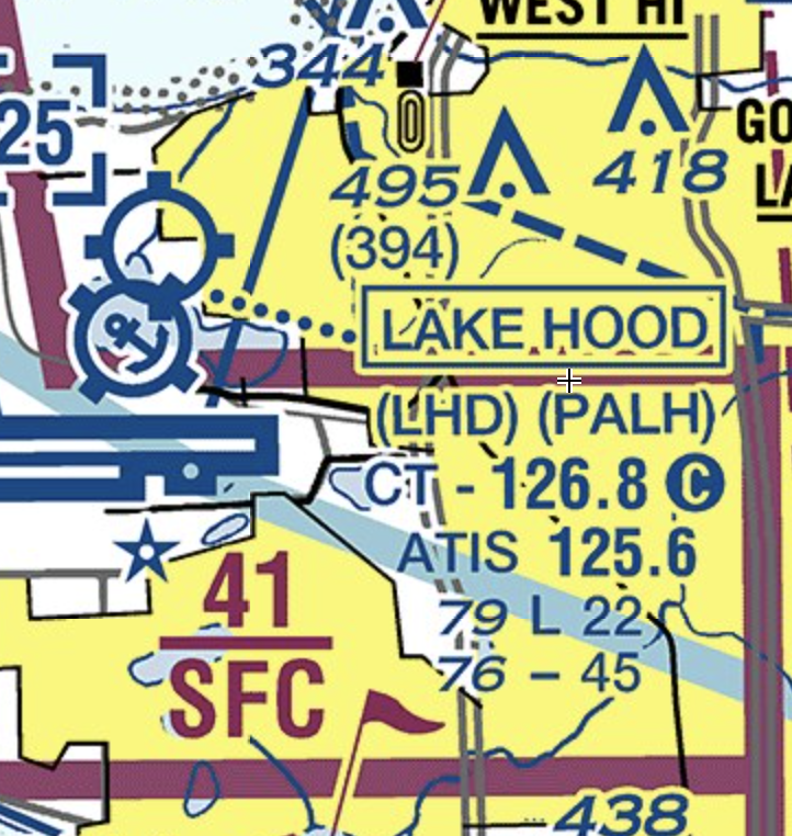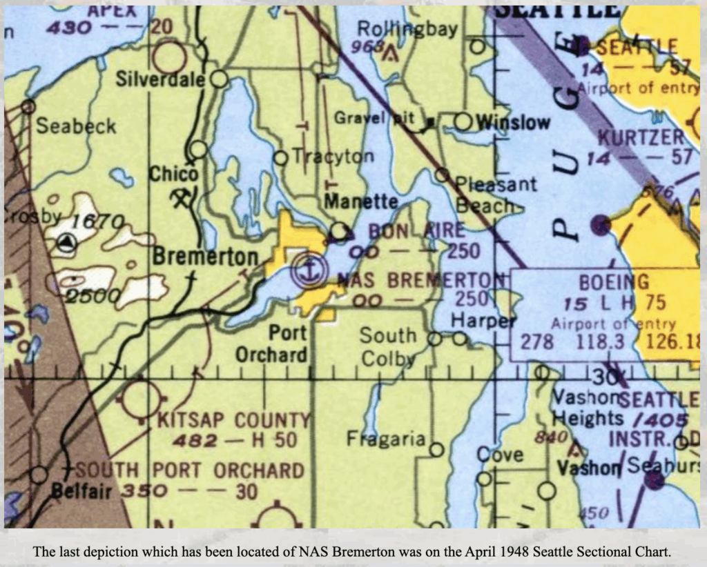 This screen grab of Naval Air Station Bremerton shows the double-ring around the anchor marking, depicting a military seaplane base, of which there are no longer any active in the United States as of 2025. The base is long gone but there’s still a shipyard where old aircraft carriers go to die, among other things. Click on the photo to read more about this closed base on Paul Freeman’s excellent site Abandoned & Lesser-known Airfields. This screen grab of Oak Harbor Naval Seaplane Base on Whidbey Island shows the double-ring marker as well. The ramps for this base are still intact and the hanger is now the Navy Exchange building. Somewhere I read that recently for an anniversary a PBY Catalina drove up the ramp for the celebration. Click on the photo to read more about this closed base on Paul Freeman’s excellent site Abandoned & Lesser-known Airfields.This final screen grab depicting the double-ring and anchor of the seaplane base when Sandpoint was a Naval Air Station Seattle seaplane base, which preceded the development of the runways. The area is now Magnuson Park. Click on the photo to read more about this closed base on Paul Freeman’s excellent site Abandoned & Lesser-known airfields.