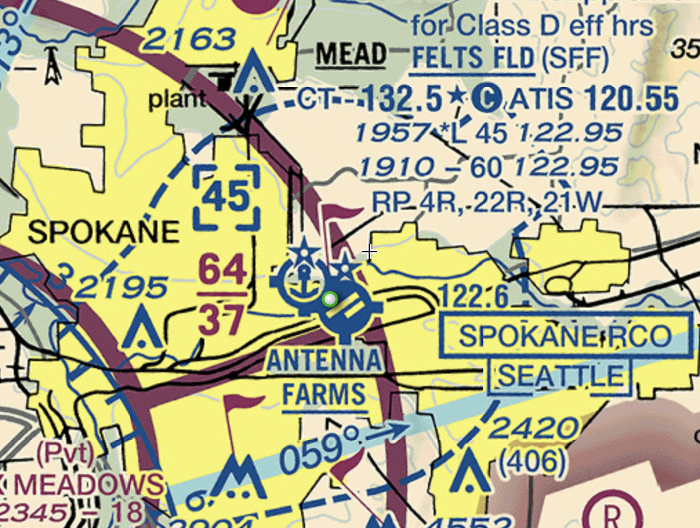 Felts Field (SFF) in Spokane has a co-located airport and seaplane base. Note that this is a Class Delta SPB and there is a beacon for both the land and sea areas. Note the information for the runways can be deduced as the land runwa that y shows “*L” for runway lighting.